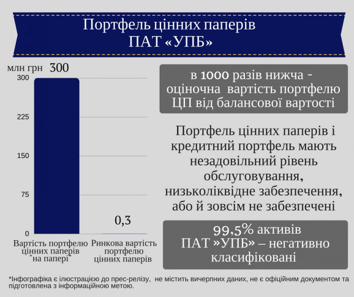 Кроме того, накануне введения временной администрации в финучреждение был продан высоколиквидный кредитный портфель банка стоимостью 2,42 млрд гривен. При этом все операции по отчуждению кредитного портфеля были осуществлены без фактического поступления средств на корреспондентский счет или наличных в кассу банка.