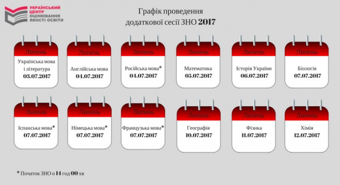 Тестирование по украинскому языку и литературе пройдет 3 июля, по английскому и русскому языкам — 4 июля, математике — 5 июля, истории Украины — 6 июля, биологии, испанскому, немецкому, французскому языкам — 7 июля, географии — 10 июля, физике — 11 июля и по химии — 12 июля.