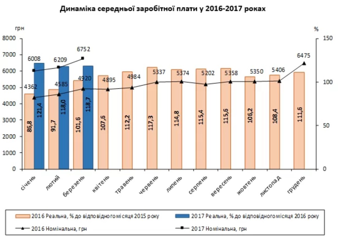 Он отметил, что по данным Госстата, средняя зарплата штатного работника в Украине в марте 2017 составила 6752 грн, а это вдвое больше минимальной зарплаты и на 8,7% больше показателя февраля. По словам премьера, такой рост вполне соответствует росту промышленного производства, которое в марте выросло более чем на 8%.