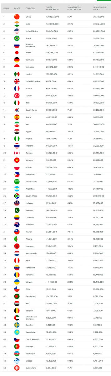 Лидером рейтинга с большим отрывом стал Китай, в котором насчитали более 700 млн пользователей смартфона. На втором месте находится Индия (300 млн), на третьем — США (226 млн). В топ-5 также вошла Россия, в которой уровень проникновения смартфонов превышает 50%. В развитых странах проникновение смартфонов достигает 60-70%.
