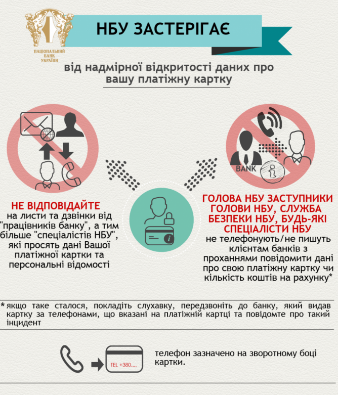 В Нацбанке подчеркнули, что работники НБУ никогда не звонят с подобными просьбами, а любые вопросы по работе с банковскими платежными карточками относятся исключительно к компетенции работников банков-эмитентов этих карт.