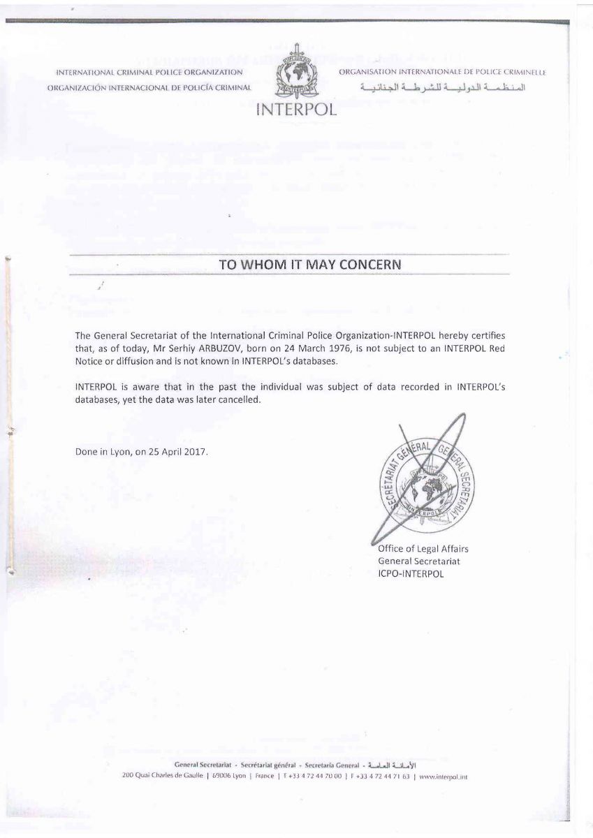 «Интерпол прекратил международный розыск нашего клиента, что означает восстановление права Сергея Арбузова на свободное передвижение. Несмотря на все попытки Генеральной прокуратуры Украины исказить факты и представить желаемое за действительное, Интерпол услышал наши аргументы и прекратил розыск», - отметили защитники.