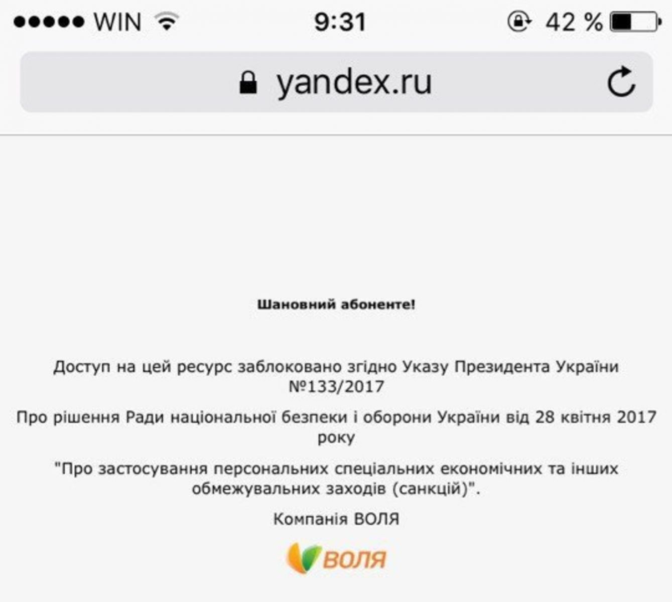 Сообщается, что на заблокированных сайтах опубликовано сообщение, где объясняется, что доступ к этим веб-ресурсоам заблокирован согласно указу президента Украины о новых санкциях Совета национальной безопасности и обороны Украины от 28 апреля 2017 года, которые предусматривают, в частности, блокирование доступа к соцсетям ВКонтакте и Одноклассники. Это сообщение на украинском языке подписано компанией «Воля».
