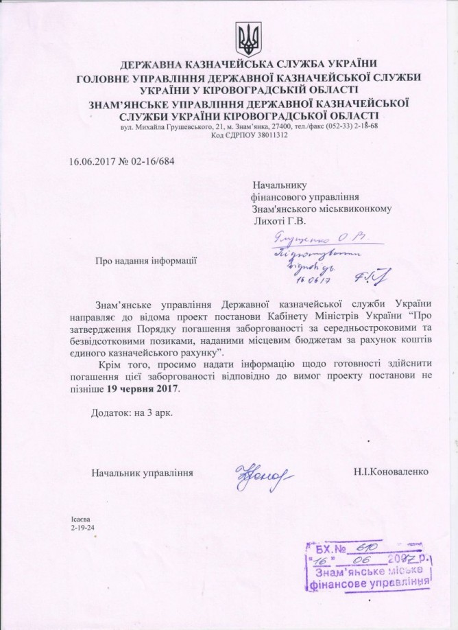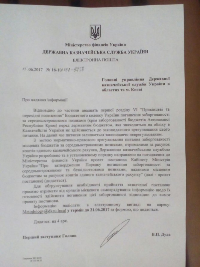 Также в письме казначейства за подписью первого заместителя главы Государственной казначейской службы Украины Дуды говорится, что Госказначейство уже разработало проект постановления о порядке погашения займов и направило его на согласование в Минфин.