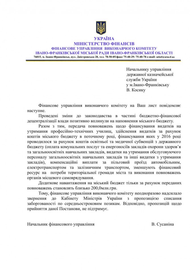«Фактически местные бюджеты накапливали долги в результате завышения расчетных объемов доходов I-ой корзины и длительного невыполнения этих показателей. [...] Задолженность по среднесрочным займам должна быть списана», — пишет в официальном письме начальник отдела экономического анализа и планирования доходов бюджета Черновицкого горсовета Светлана Адамович.