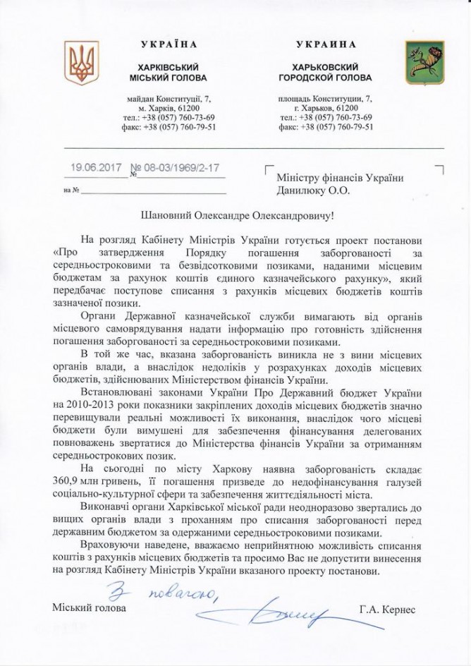 Так, Харьковский городской голова Геннадий Кернес написал письмо министру финансов Александру Данилюку, в котором заявил, что «установленные законами о госбюджете в 2010-2013 годах показатели доходов превышали реальные возможности их выполнения» и поэтому города вынуждены были занимать средства у казначейства. Харьков должен госказначейству 360,9 млн грн. По мнению Кернеса, задолженность перед казначейством также должна быть списана.