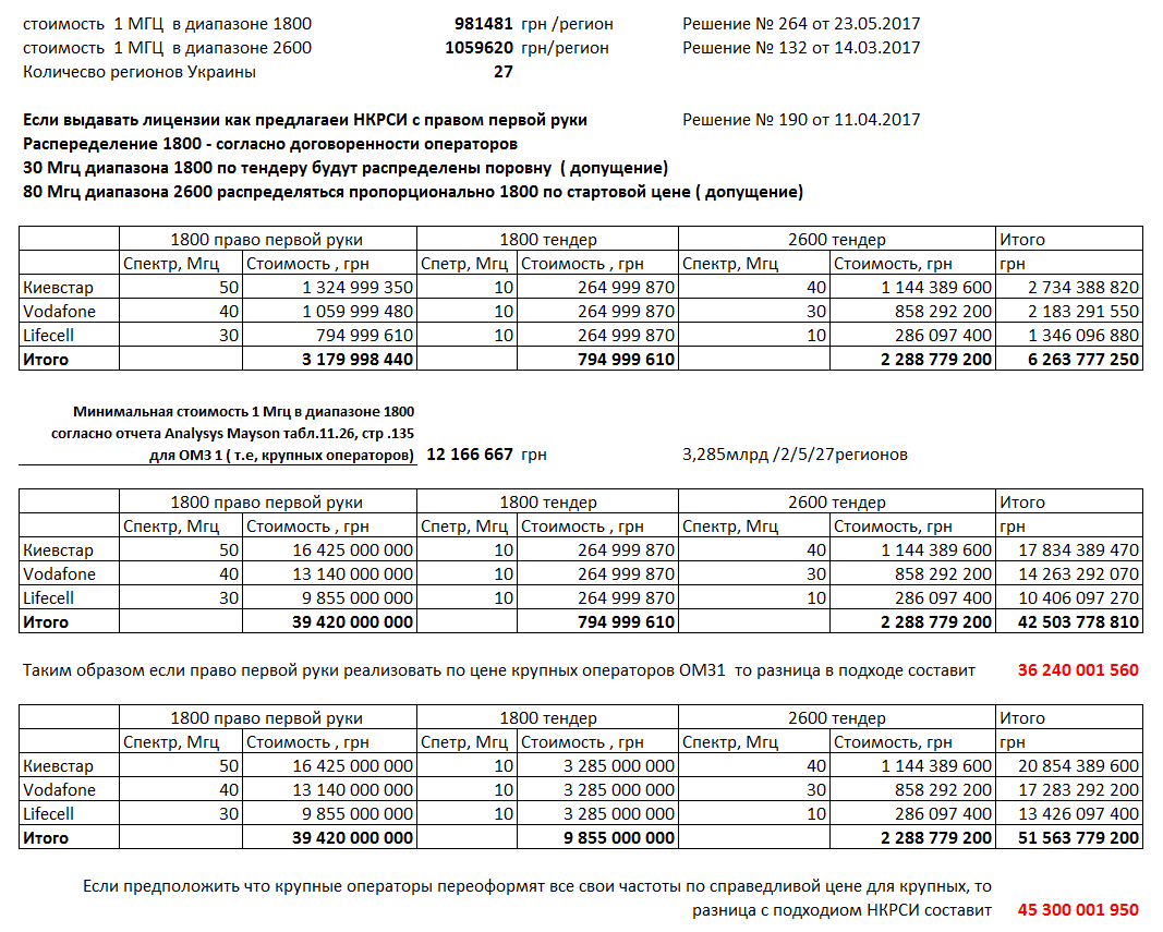 В частности, регулятор планирует продать частоты диапазона 1800 МГц с суммарным спектром 800 МГц трем мобильным операторам за общую сумму в 3,179 миллиарда гривен. При этом на данный спектр не планируется даже проведение тендера – сотовые компании смогут приобрести частоты, воспользовавшись правом «первой руки», предоставленным им решением НКРСИ №190 от 11 апреля 2017 года. Таким образом, частоты будут проданы в 13 раз дешевле их реальной стоимости. Это утверждение взято не «с потолка», а из отчета международной аудиторской компании Analysys Mason, которая рекомендовала установить для крупных операторов цену в 12 166 667 грн. за 1 МГц. Если бы частоты были проданы по этой цене, выручка государства составила бы 39,42 миллиарда гривен, пишут журналисты.