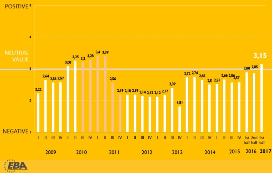 Индекс инвестиционной привлекательности Украины по версии топ-менеджеров членских компаний Европейской Бизнес Ассоциации вышел из отрицательной плоскости, сообщил департамент коммуникаций Европейской Бизнес Ассоциации.
