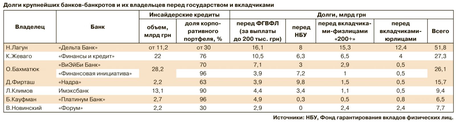 Среди наибольших должников – такие финучреждения как "Дельта-банк" (общая сумма долга – 51,8 млрд грн, владелец – Николай Лагун), "Финансы и кредит" (совокупный долг – 27,3 млрд грн, владелец – Константин Жеваго), банки Олега Бахматюка "ВиЭйБи Банк" и "Финансовая инициатива" (совокупный долг – 26,1 млрд грн), банк "Надра" Дмитрия Фирташа (общая сумма долга – 15,7 млрд грн), "Имэксбанк" (владелец – Леонид Климов, долг – 9,4 млрд грн), "Платинум банк" Бориса Кауфмана (долг – 6,5 млрд грн), а также банк "Форум" Вадима Новинского (долг – 7,7 млрд).