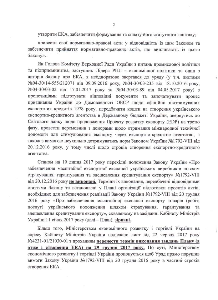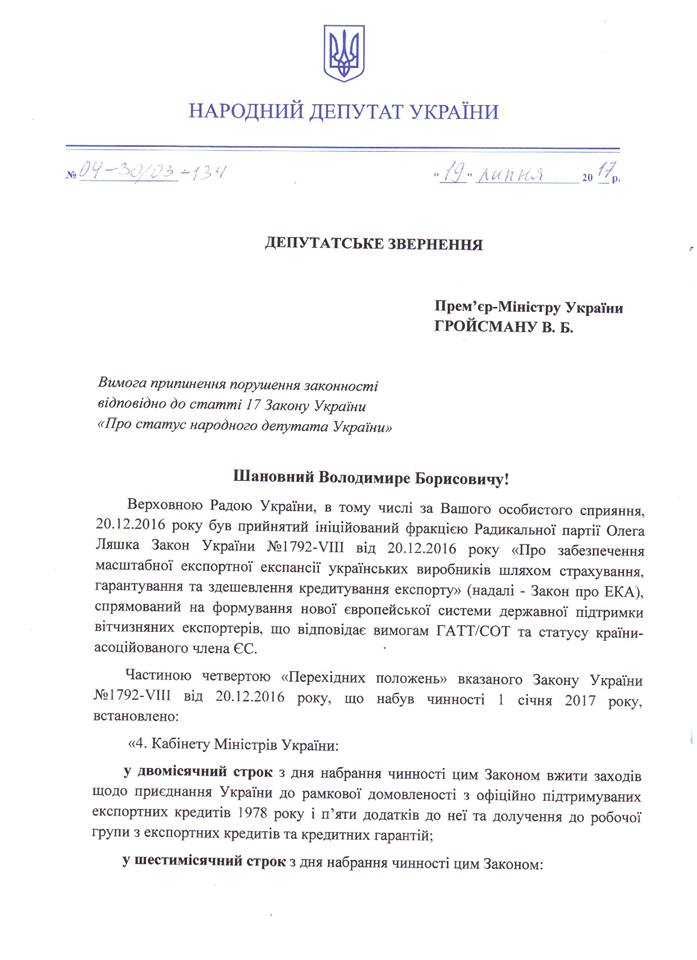 Он отметил, что направил премьер-министру Владимиру Гройсману депутатское обращение с требованием прекращения нарушения законности (согласно ст. 17 Закона «О статусе народного депутата Украины»).
