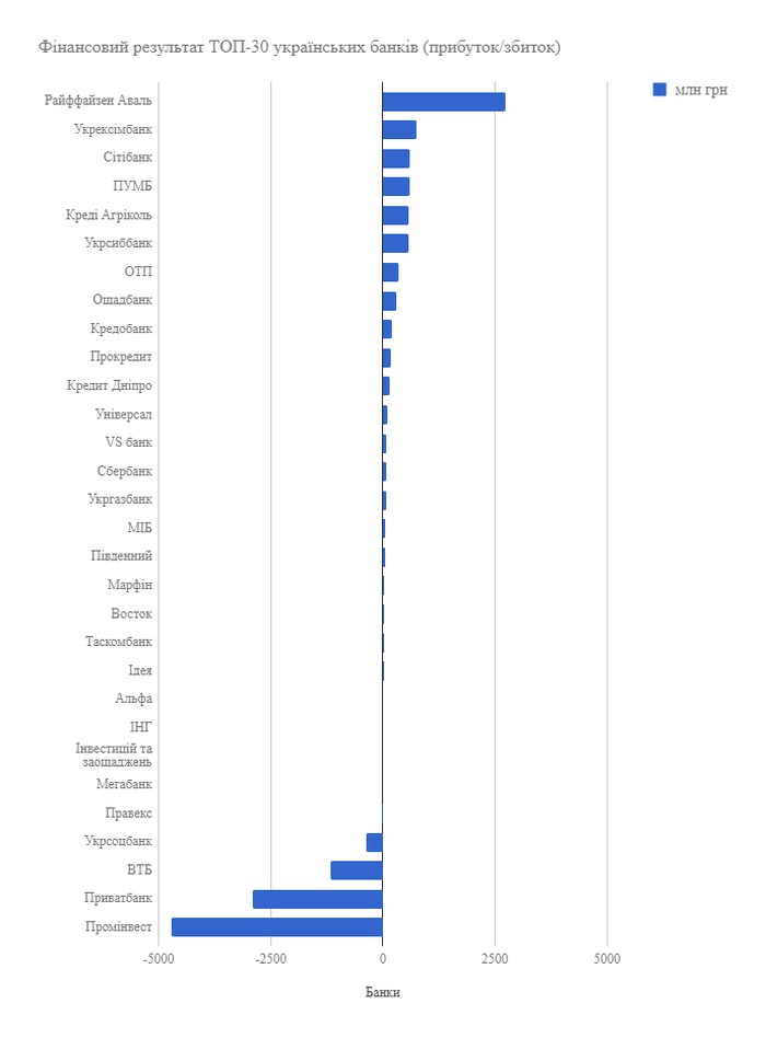 Самыми убыточными украинскими банками стали Проминвестбанк (4,720 млрд грн), Приватбанк (2,908 млрд грн) и ВТБ (1,106 млрд грн).