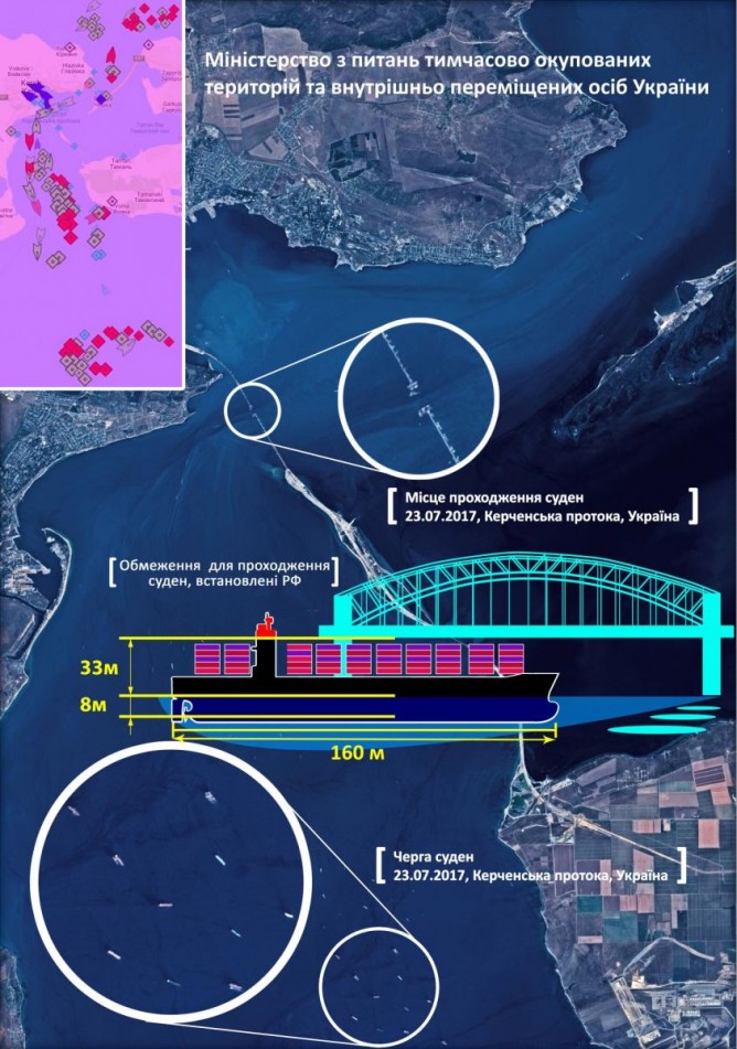 «РФ вопреки Конвенции ООН по морскому праву устанавливает ограничения для прохождения судов через Керченский пролив. Так, высота арки будет иметь ограничения в 33 метра над уровнем моря. Кроме того, если раньше проход Керченского пролива был разрешен судам длиной до 200 метров, то теперь Российская Федерация заявляет об ограничении разрешенной длины в 160 метров», — заявили в МинАТО.