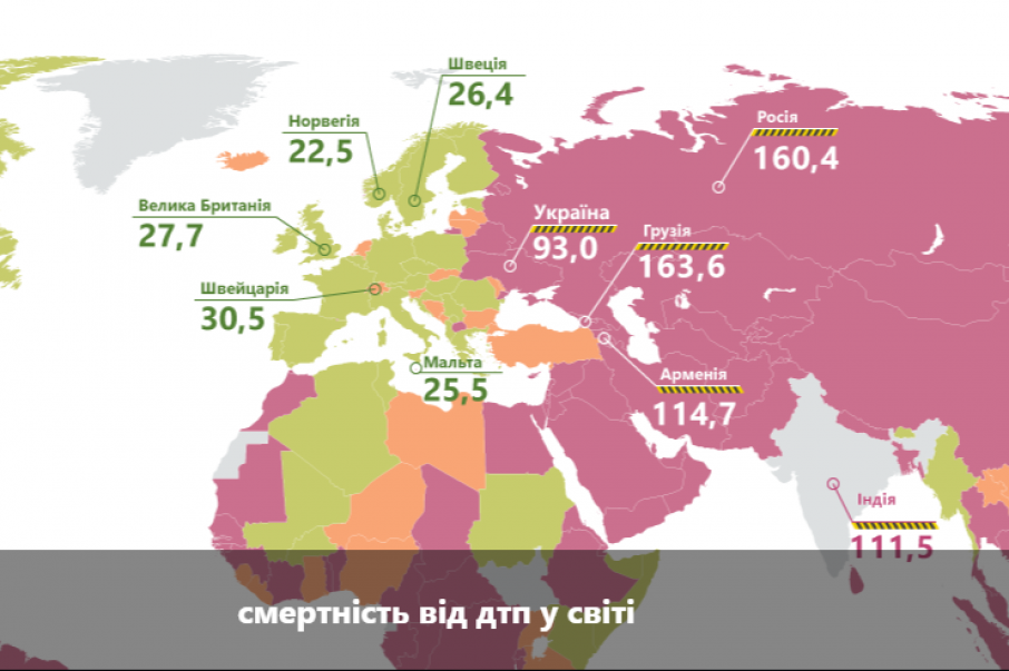 В результате дорожно-транспортных происшествий в Украине погибает 93 человека на один миллион населения. В неутешительном рейтинге Украину опережают только: Грузия (163,6 человека), Россия (160,4), Армения (114,7), Индия (111,5), США (109,5), Болгария (98,6), Турция (95,7), Латвия (94,5) и Албания (93,5).