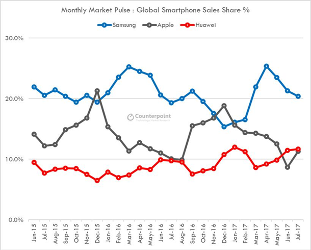 Компания Huawei, по данным Counterpoint, и июне и июле этого года обошла своего американского конкурента Apple по объемам продаж смартфонов. Она заняла вторую позицию в рейтинге, после южнокорейской Samsung.