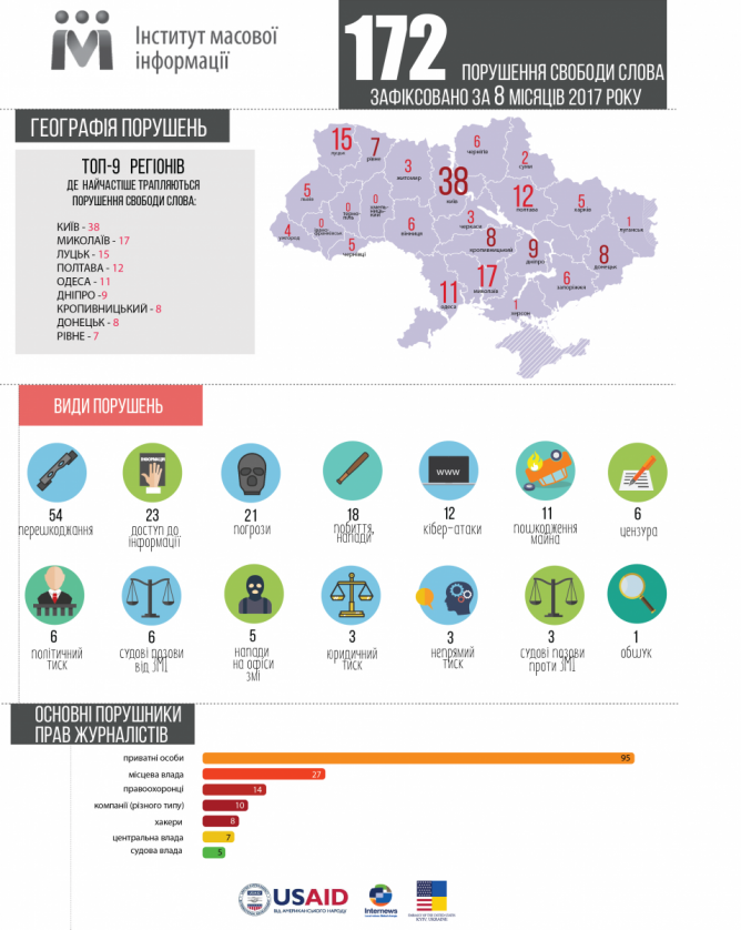 Согласно результатам ежемесячного мониторинга ИМИ «Барометр свободы слова», что за 8 месяцев этого года ИМИ зафиксировал в стране Украины 172 случая нарушений свободы слова. В прошлом году за этот же период было зафиксировано 184 случая. Наибольшее количество нарушений с начала было зафиксировано в категории «препятствование законной профессиональной деятельности журналистов» — 54 против 71 случая за аналогичный период прошлого года. Эксперты ИМИ фиксируют уменьшение физической агрессии в отношении журналистов в Украине. За этот год зафиксировано 18 случаев насилия против 24 случаев избиений журналистов годом ранее.