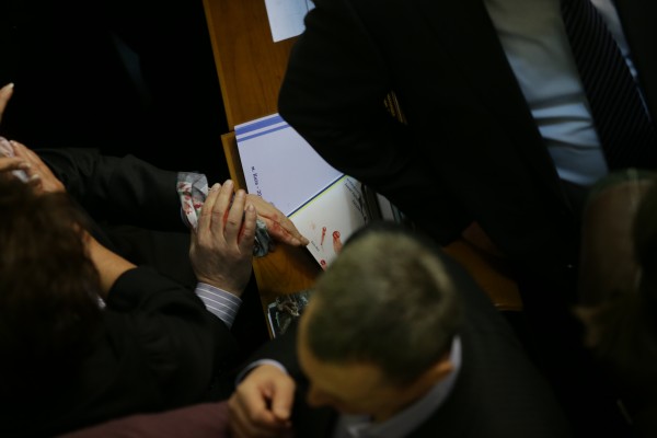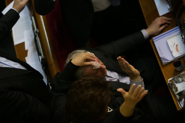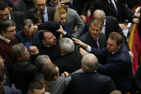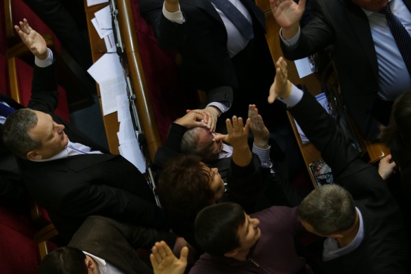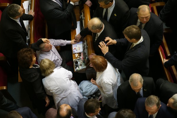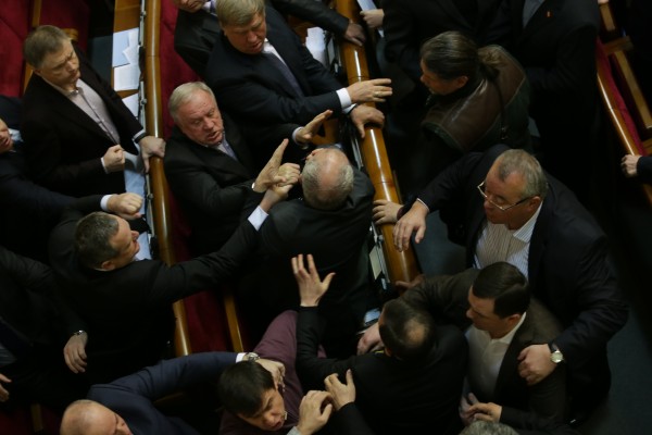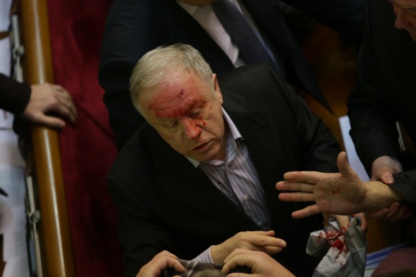 Во время принятия государственного бюджета на 2014 г. в зале Верховной рады произошло несколько потасовок, ряд депутатов даже получили ранения.