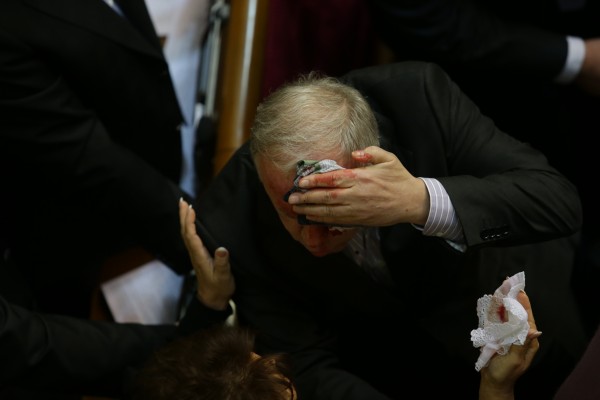 В частности, во время столкновения депутату от Партии регионов Владимиру Малышеву разбили лоб.