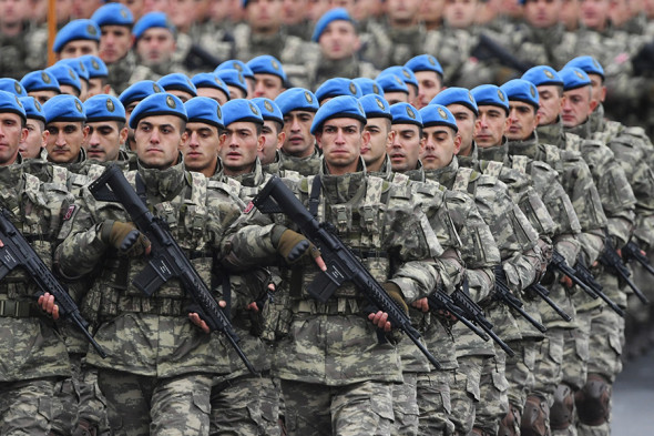 На центральной трибуне находились президенты Азербайджана и Турции Ильхам Алиев и Тайип Эрдоган. Турецкий лидер прибыл в Баку накануне с двухдневным официальным визитом, в том числе и для того, чтобы лично присутствовать и, как заявили в Анкаре, «поздравить Вооруженные силы Азербайджана».