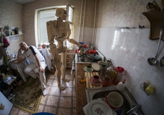 Украинец Дмитрий Баландин работает оператором крана. Но в свободное время конструирует из дерева уникальных роботов, которые могут играть в куклы, готовить, смотреть телевизор.