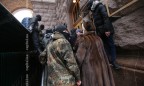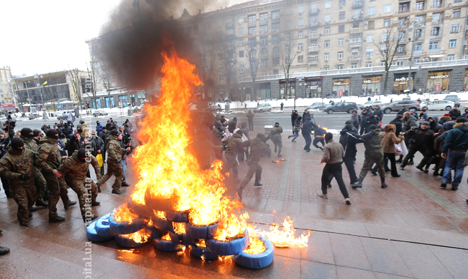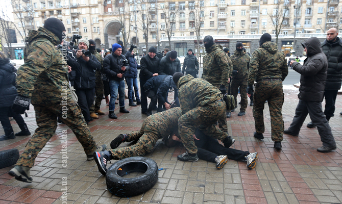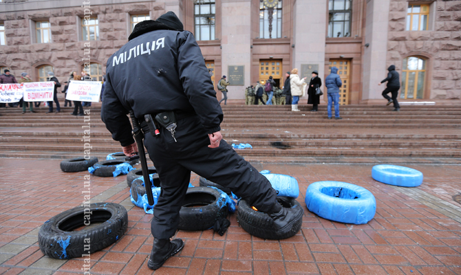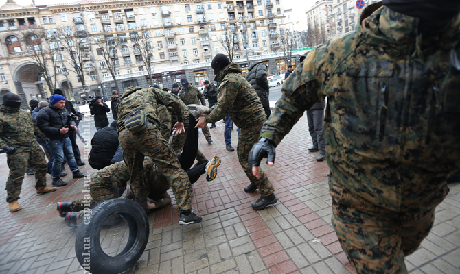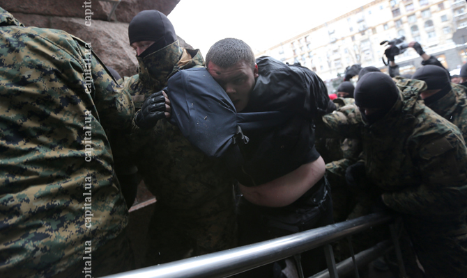 Во время акции входы в здание КГГА охраняли неизвестные в камуфляже и балаклавах без опознавательных знаков. Когда протестующие попытались силой прорваться в здание через боковой вход, люди в камуфляже разогнали их, распылив слезоточивый газ и применив силу. Возникла потасовка.