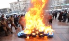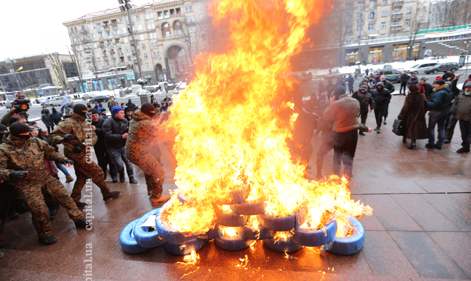 Кроме того, несколько десятков активистов организации «СМЕРЧ» выложи под зданием КГГА шины от автомобилей, обмотанные синими мусорными пакети и с надписью: «4 грн». После этого шины подожгли.