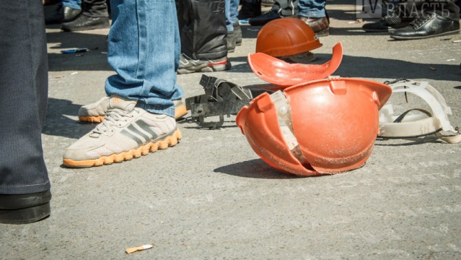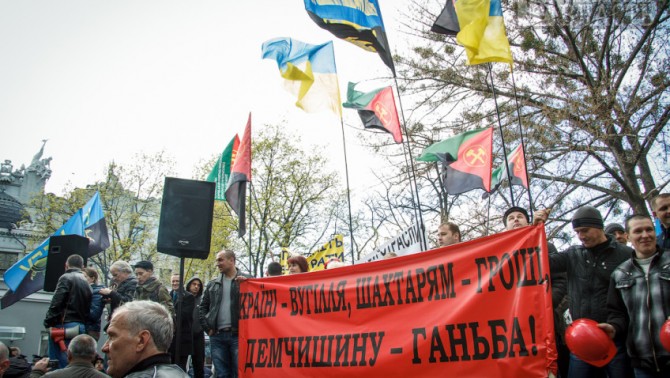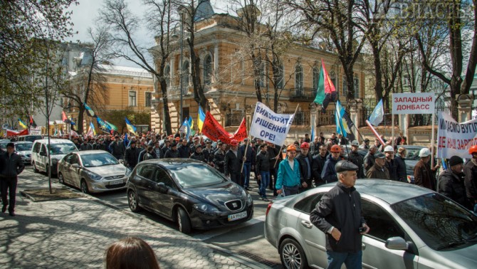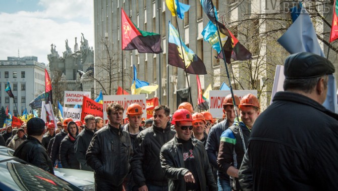 Время от времени горняки стучат касками об асфальт. На транспарантах видны лозунги «Дайте шахтерам не подачки, а возможность зарабатывать», «Верните наши деньги», «Вимагаємо зустрічі з президентом» Из-за передвижения по улицам колонн демонстрантов, в центре Киева серьезно затруднено движение.