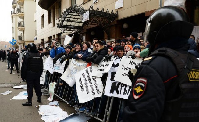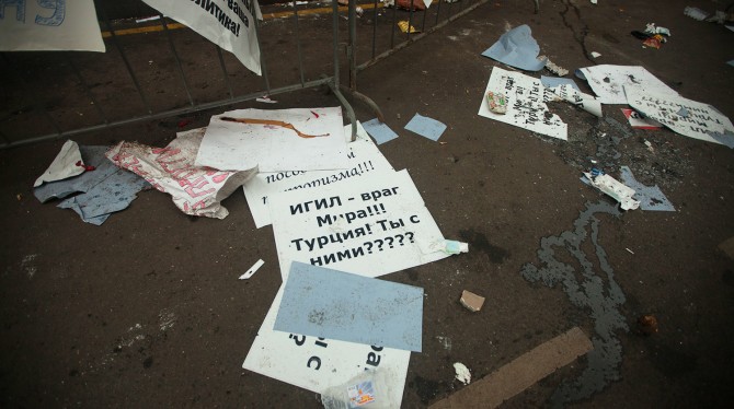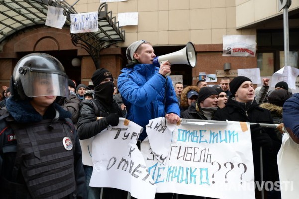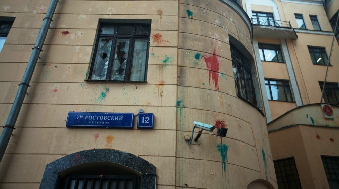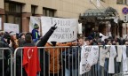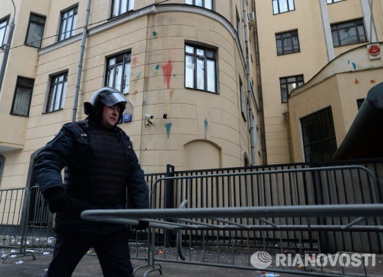 Как уточняется, протестующие закидали камнями посольство Турецкой Республики в центре Москвы.