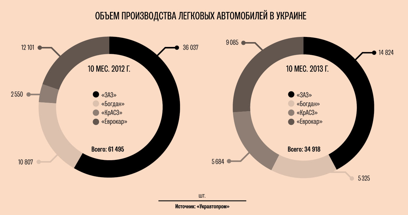 Первый квартал 2013 г. оказался самым печальным в истории отечественной автомобильной промышленности. По словам директора департамента маркетинга и экономического анализа ассоциации «Укравтопром» Георгия Овсянникова, в первом полугодии время от времени останавливались конвейеры на Запорожском автомобильном заводе, Кременчугском автосборочном заводе и на предприятиях корпорации «Богдан».