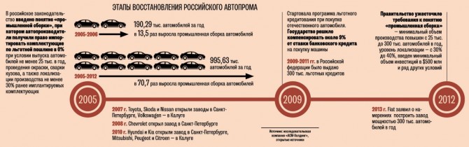 Падение производства во многом обусловлено введением осенью 2012 г. в России утилизационного сбора на импортные автомобили. До этого в соседнюю страну экспортировалось до 40‑50 % машин, произведенных на «Богдан Моторс» и ЗАЗ, рассказывает старший аналитик инвестиционной компании «АРТ Капитал» Алексей Андрейченко. После введения сбора объем экспорта в Россию сократился почти в пять раз, поскольку украинские автомобили стали неконкурентоспособными на российском рынке, указал он.