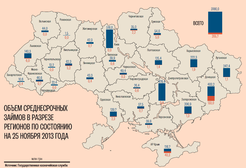 В январе-ноябре 2013 г. регионы позаимствовали у Государственной казначейской службы почти 42 млрд грн на покрытие временных кассовых разрывов и более 3,1 млрд грн среднесрочных займов. Такие данные «Капиталу» предоставили в Госказначействе. При этом, по информации ведомства, за отчетный период возникли существенные проблемы с возвратом средств. В частности, если по краткосрочным ссудам выплачено более 97 % долга — осталось вернуть лишь немногим более 1 млрд грн, то по среднесрочным погашено только 205 млн грн, или 6,4 % взятых до 25 ноября 2,9 млрд грн.