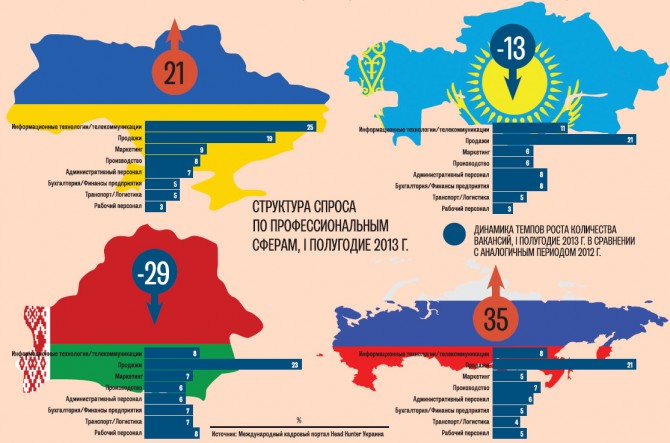 Самые высокие темпы роста показали Россия и Казахстан, число вакансий на рынке которых за первые шесть месяцев 2013 г. в сравнении с аналогичным периодом прошлого года увеличилось на 152 % и 163 % соответственно. Показатели роста белорусского и украинского рынков были значительно скромнее — 122 % и 137 % соответственно. При этом положительной динамика темпов роста оказалась только для Украины (+21 %) и России (+35 %), а рынки труда Казахстана (–13 %) и Беларуси (–29 %) в нынешнем году снизили обороты.