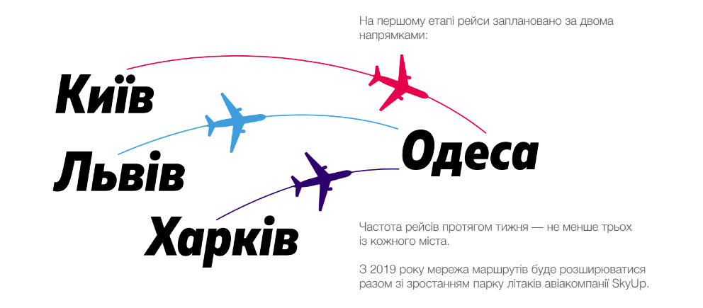 «Частота рейсов в течение недели — не менее трех. С 2019 года сеть маршрутов будет расширяться вместе с ростом парка самолетов», — прогнозирует гендиректор Sky Up Евгений Хайнацкий.