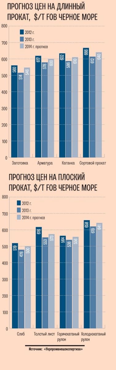 Согласно прогнозам «Укрпромвнешэкспертизы», объем производства стали возрастет на 2,7 %, среднегодовая цена продажи проката на экспорт и на внутреннем рынке вырастет на 5 %, рентабельность по EBITDA улучшится на 4 % (в 2013 г. ожидается падение на 2,3 %), общие объемы выручки от реализации проката вырастут на 8 % и возрастут поступления валюты от экспорта проката — на 7 %.
