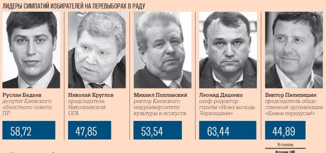 К моменту сдачи номера в печать в ЦИК поступили данные 100 % протоколов из трех округов. Согласно им, в округе № 132 победил председатель Николаевской государственной администрации Николай Круглов, в округе № 194 — ректор Киевского национального университета культуры и искусств Михаил Поплавский, в округе № 223 — экс-председатель Шевченковской райгосадминистрации Киева Виктор Пилипишин.