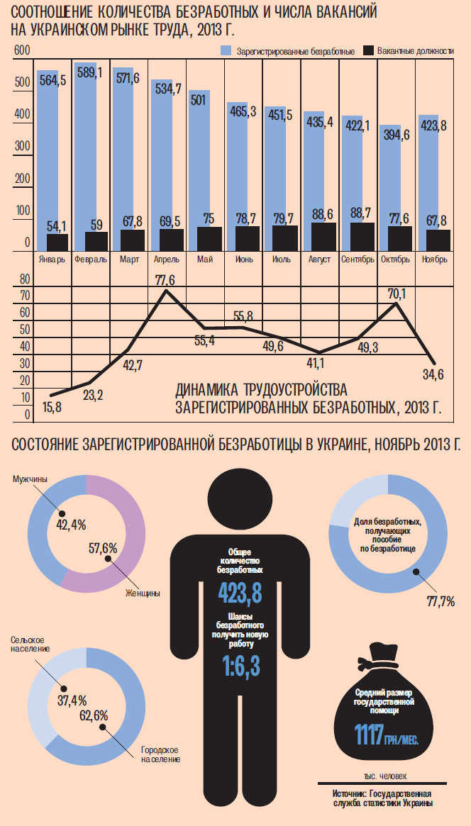 Этот факт означает, что на сегодняшний день украинский рынок труда готов трудоустроить только 16 % безработных, т. е. шансы человека, потерявшего работу в Украине, восстановить свою трудовую деятельность равны 1:6,3.