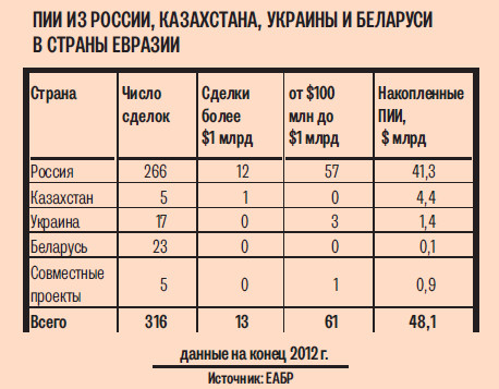 В отчете аналитики ЕАБР отмечают, что львиная доля общих накопленных инвестиций приходится на Россию — $ 41,3 млрд. При этом инвестиции из этой страны за четыре года увеличились на 72 %. Наибольший прирост обеспечили инвестиции Сбербанка России и Магнитогорского металлургического комбината в Турции, «ВымпелКома» в Италии и «Роснефти» в Германии. Украина же закрепилась на третьей позиции после Казахстана с общей накопленной суммой капиталовложений $ 1,4 млрд. Сколько именно инвестиций пришлось на период с начала 2009 г., в отчете не говорится, но уточняется, что Киеву удалось сохранить стабильность в объемах инвестиций. При этом, согласно данным ЕАБР, ни одна инвестиция украинских компаний не превышала сумму в $ 1 млрд. И только три из семнадцати капиталовложений составляли более $ 100 млн. В то же время Государственная служба статистики свидетельствует о других данных: за четыре года сумма накопленных ПИИ из Украины едва превысила $ 270 млн, а за весь период инвестирования эта сумма составила $ 6,4 млрд. Причем основная часть этих капиталовложений пришлась на Кипр. Отличие данных ЕАБР и Госстата можно объяснить тем, что банк в своем исследовании принимал во внимание лишь те инвестиции, объем которых превышал $ 10 млн.
