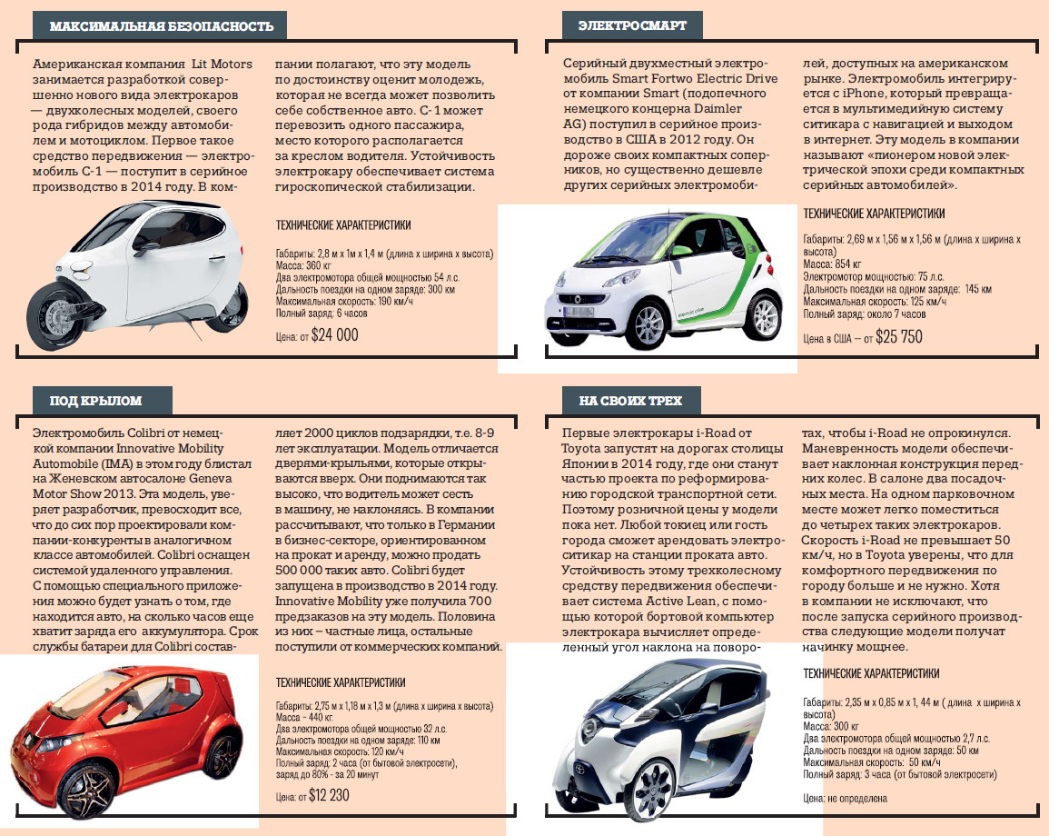 Ими можно управлять удаленно с помощью планшета или смартфона, их вес не превышает 500 кг, заряда батарей хватает на весь день поездок по городу, а цена, в отличие от дорогих старших собратьев, достаточно демократична. В следующем году ставку на одно- и двухместные электрокары сделают многие крупные автомобильные компании. Они уверены, что эти модели будут востребованы в перегруженных транспортом мегаполисах и в ближайшие годы станут идеальным городским средством передвижения. Многие европейские правительства активно поддерживают идею эксплуатации электромобилей и освобождают владельцев таких авто от налогов на транспортное средство. К примеру, в Германии владельцы электрокаров на десять лет освобождены от налогов на эти средства передвижения, а в Норвегии, которая является мировым лидером по продажам электромобилей на душу населения, их водители, кроме налоговых льгот, бесплатно пользуются платными дорогами и сетью специальных заправок для электрокаров.