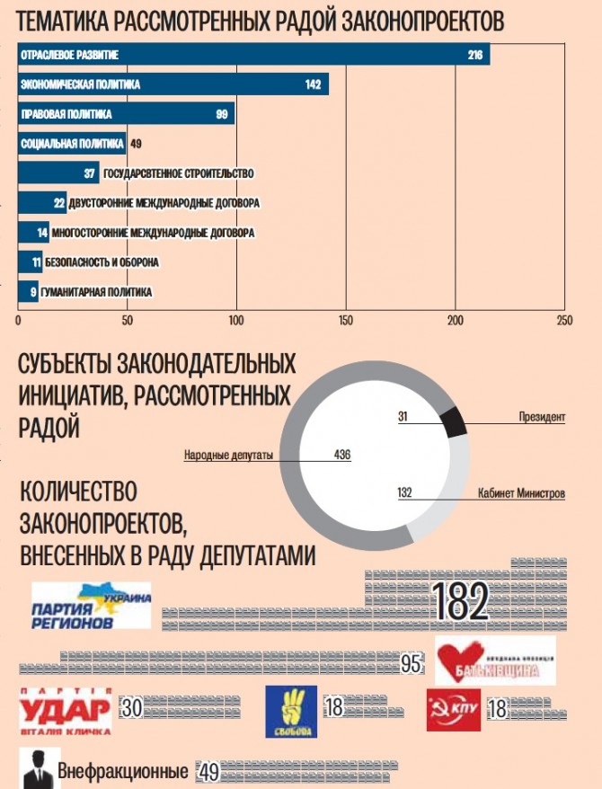 Из всех субъектов законодательной инициативы, которые наделены правом вносить свои законопроекты, парламент в большей степени оказал поддержку президенту Виктору Януковичу — почти 84 % поданных им проектов были приняты. Рада также поддержала каждую вторую инициативу Кабинета Министров — более 50 % законопроектов было принято в целом.