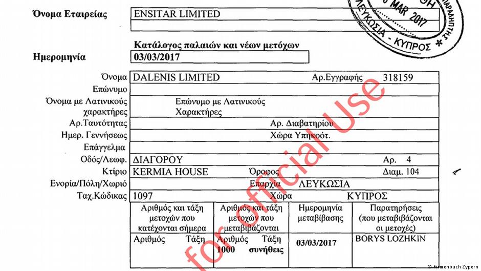 Инвестиции в Германии осуществляются Ложкиным через кипрскую компанию Ensitar Limited, бенефициаром которой он стал в марте 2017