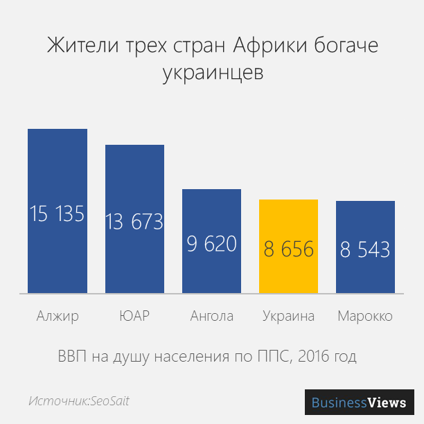 А если взять страны, сопоставимые с Украиной по населению, и посчитать ВВП на человека, то нас опережают три государства самого бедного региона на планете.