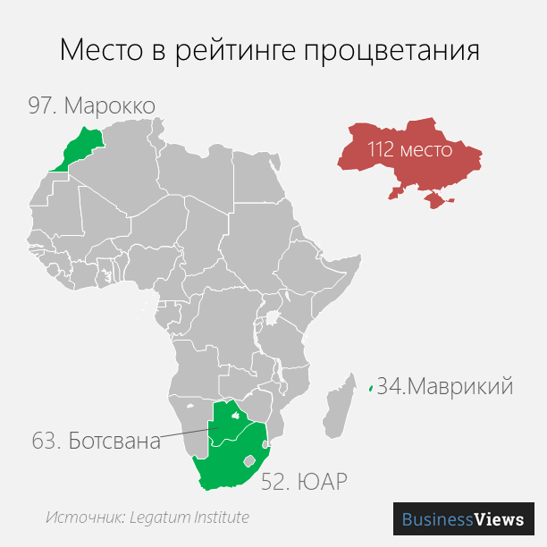 Украина находится на 112 месте в рейтинге процветания. Ботсвана — на 63. Ботсвана выигрывает у Украины почти по всем показателям, в том числе по качеству бизнес-окружения и даже здравоохранения.