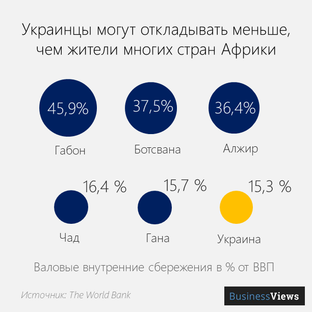 Есть интересный экономический показатель — объем валовых внутренних сбережений. Это сбережения домохозяйств, компаний и государства. Их считают в процентах к ВВП. В Украине данный показатель составляет 15% ВВП. В Габоне — почти половину ВВП.