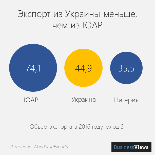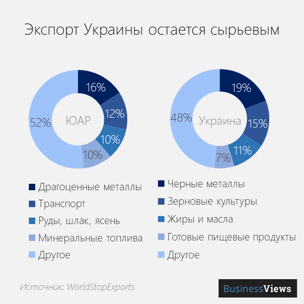 У обеих стран лидирующие экспортные продукты — это металлы. Но если из сложных продуктов с высокой добавленной стоимостью Южная Африка поставляет миру транспорт, то Украина обеспечивает планету едой.