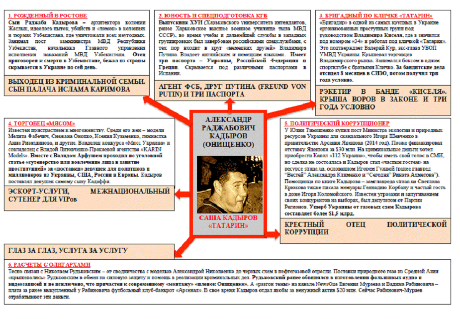По данным милицейского досье, Онищенко-Кадыров стал организатором конкурсов красоты, откуда «забирал под свое крыло» девушек. В итоге, по данным правоохранительных органов, услугами моделей Кадырова пользовались как представители отечественного истеблишмента, так и многие влиятельные заграничные политики и бизнесмены, что позволило Кадырову обзавестись серьезными связями, в т.ч. с нынешним президентом США Дональдом Трампом.