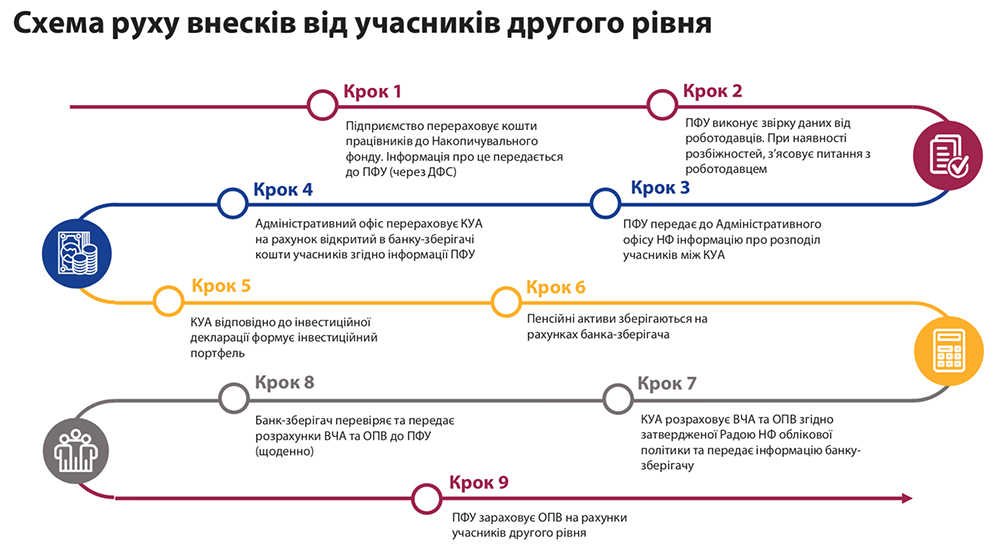 Из-за финансово-инвестиционной составляющей второго уровня главным органом, ответственным за его внедрение, является Национальная комиссия по ценным бумагам и фондовому рынку — НКЦБФР. По закону, комиссия утверждает методику оценки накопленных пенсионных активов, выдает лицензии компаниям по управлению ими.