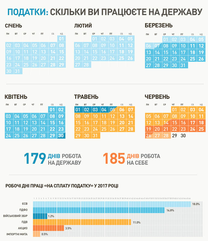 Также общество подготовило инфографику, на которой показало, сколько дней в году украинец работает на тот или иной налог.