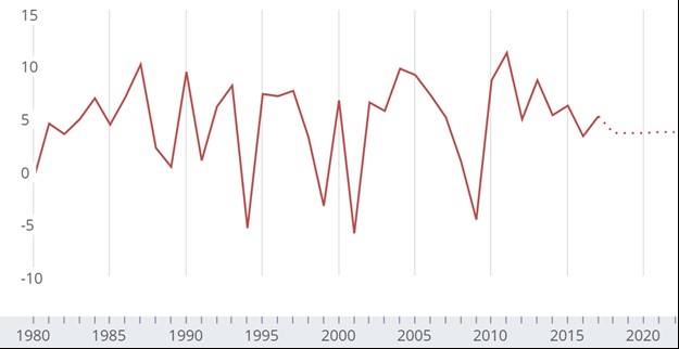 В частности, с 1980 по 2017 годы динамика реального ВВП Турции (см. график) имеет неустойчивый характер, бурные подъемы меняются не менее резкими спадами (хотя, после 2008 года экономика растет стабильнее, падение ВВП фиксируется реже и глубина этого падения меньше, чем в ряд лет, приходящихся на период с 1980 по 2008 годы).