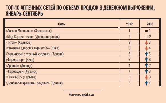 На аптечном рынке разгорается борьба за лидерство. По итогам января-сентября 2013 г., в первую тройку крупнейших аптечных сетей по товарообороту вошла харьковская компания «Титан», которая ранее занимала девятое место, свидетельствуют данные профильного сайта Apteka.ua. В целом, по информации Apteka.ua, доля топ-3 среди аптечных сетей увеличилась с 6,9 % до 7,7 % от совокупной выручки аптек. За девять месяцев через розницу было продано фармпродукции на 25,6 млрд грн.