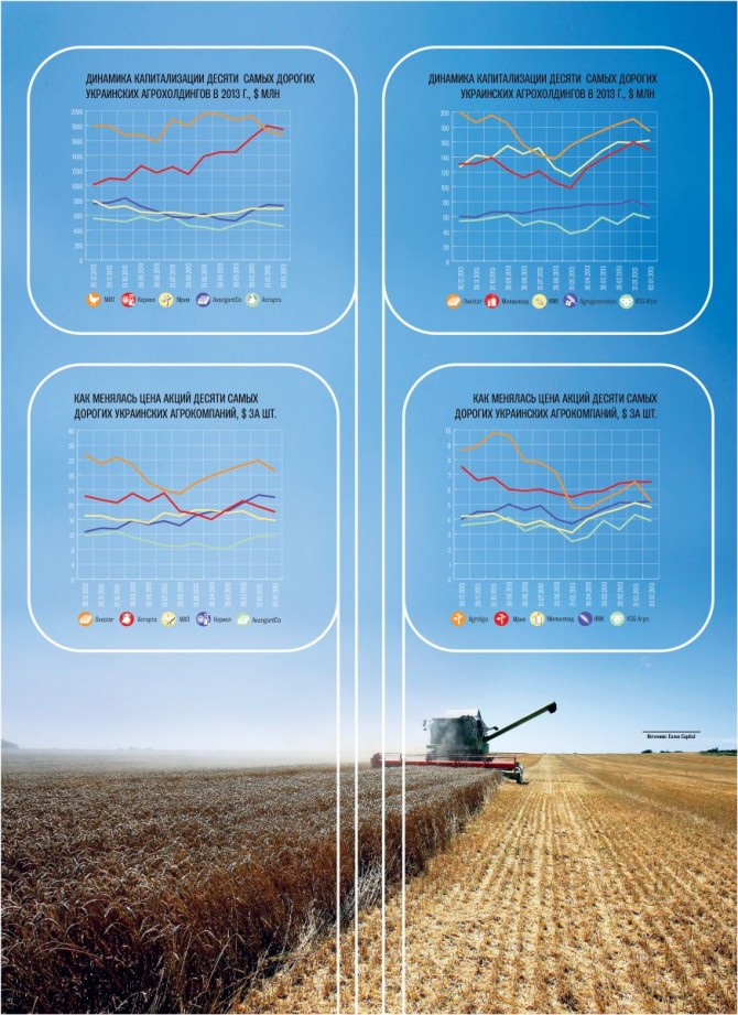За прошлый год стоимость украинских аграрных холдингов на международных фондовых биржах снизилась на 13,1 % — до $ 5,55 млрд, сообщил «Капиталу» финансовый аналитик консалтингового агентства «Украгроконсалт», рассчитывающего Украинский аграрный индекс, Алексей Моргун. «Снижение финансовых показателей компаний и политический кризис привели к тому, что недоверие иностранных инвесторов существенно увеличилось», — говорит специалист департамента инвестиционного банкинга инвесткомпании Pro Capital Investment Сергей Парпуланский.