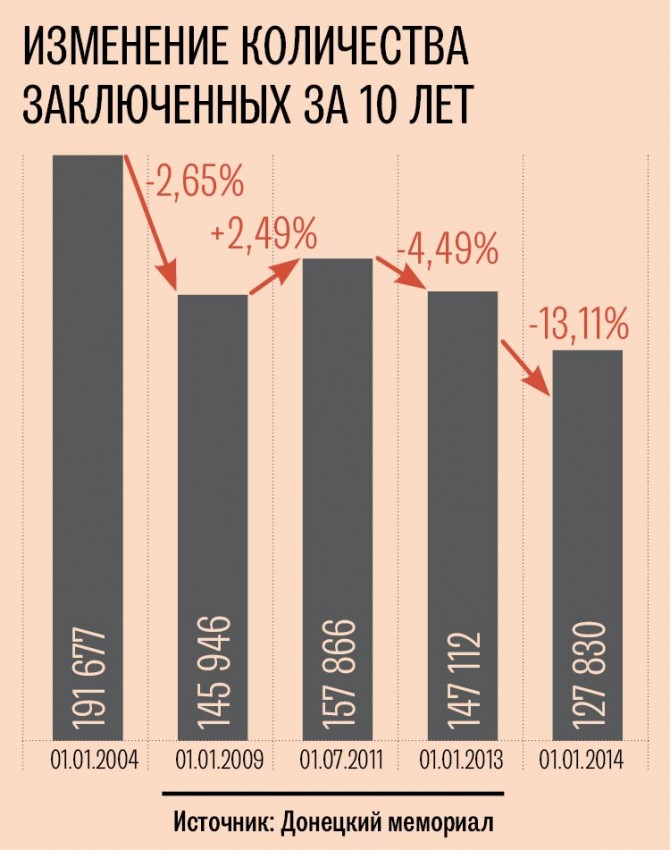 Как рассказал «Капиталу» председатель общественной правозащитной организации «Донецкий мемориал» Александр Букалов, показатели пенитенциарной службы являются рекордно низкими за всю историю независимости Украины. До этого самое большое сокращение было зафиксировано в начале 2004 г., когда этот показатель снизился на 3 % — с 197427 до 191677 человек.